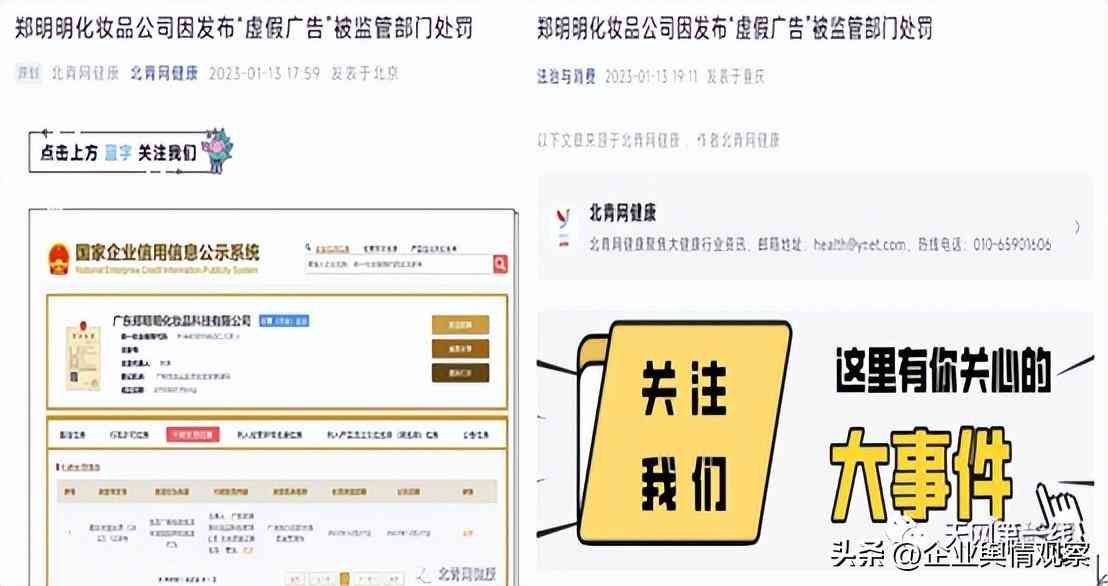 2023年1月13日认证主体为北京青年报的北青网健康发表《郑明明化妆品公司因发布“虚假广告”被监管部门处罚》的文章,同日重庆法治报“法治与消费”专栏对文章进行了转载报道。