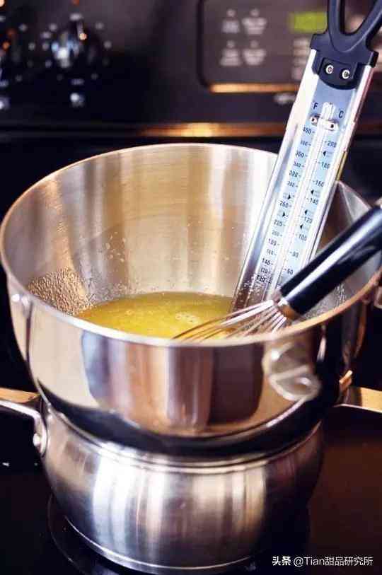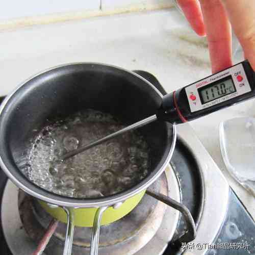 1、将水33g、白砂糖73g放入小锅中,小火熬煮,温度计设定为118度