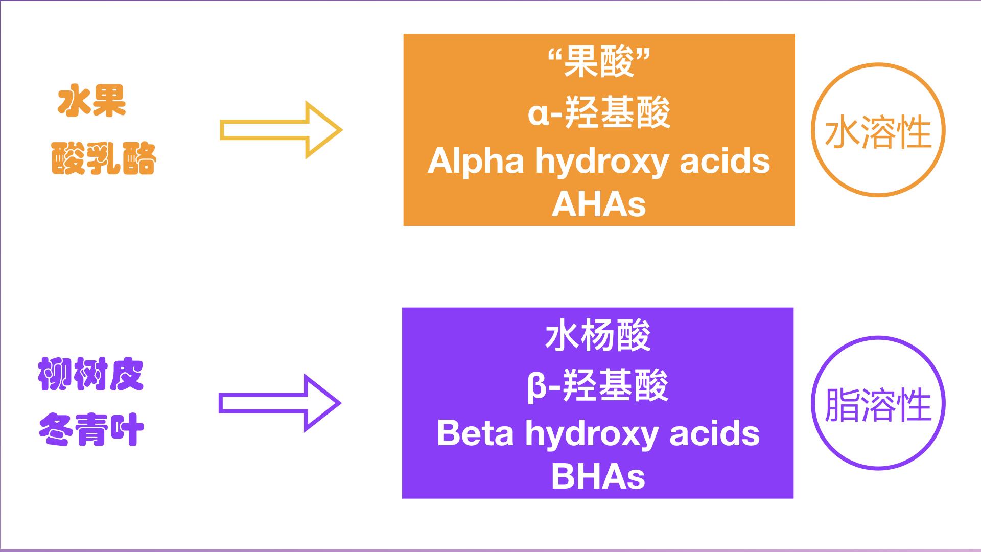 化学不太懂没关系,我们只需要记住「果酸」和「水杨酸」是「化学剥脱」用到的两类酸。