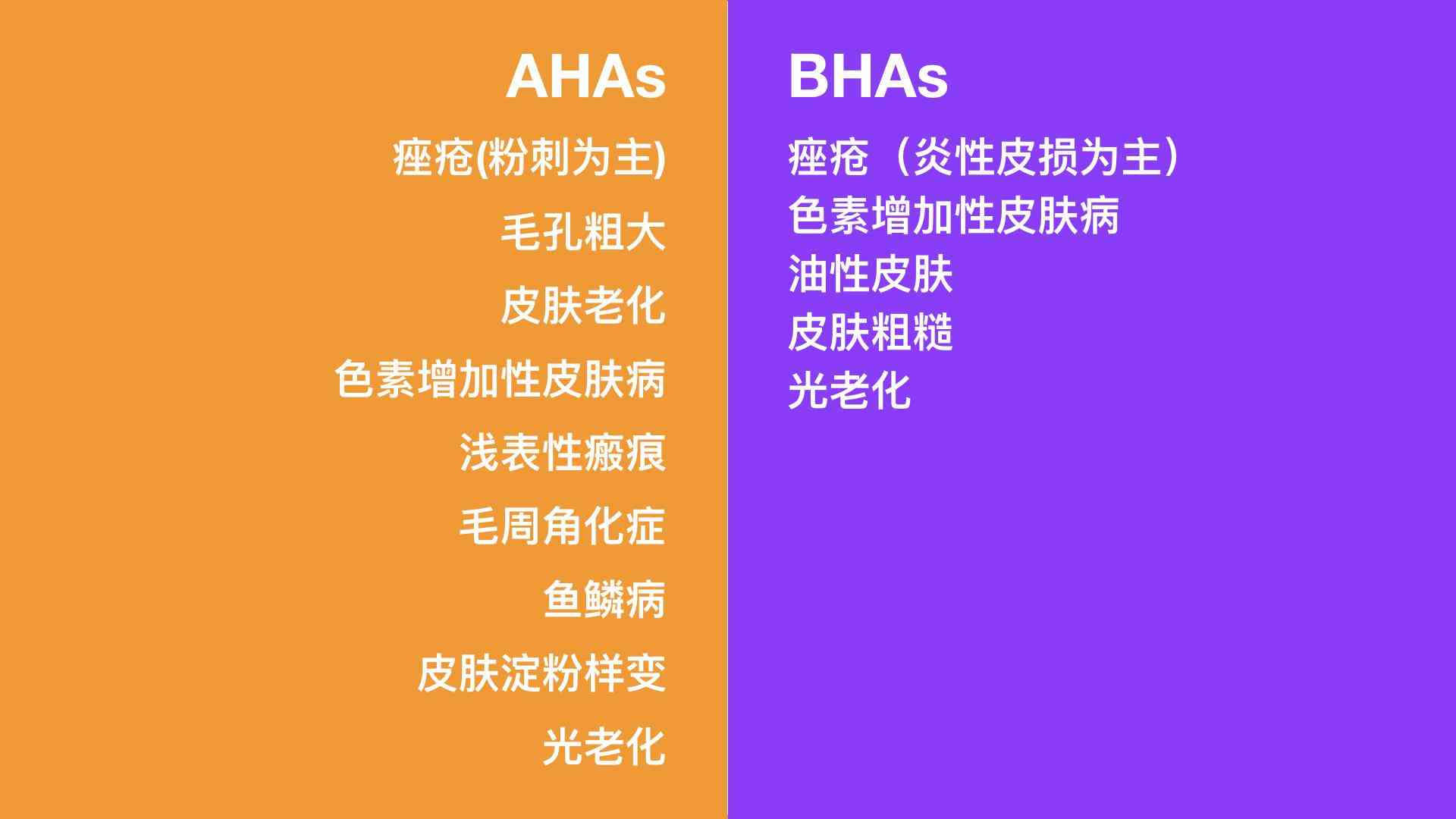 油性肌肤,以红肿发炎的痘痘为特点的,适合用「BHA」;干性肌肤,皮肤较少发红或不发红,但是能摸到一颗颗丘疹的,适合用「AHA」;油性皮肤,皮肤不发红但能摸到一颗颗丘疹的,适合用「杏仁酸」。敏感肌肤,根据敏感程度不同选择第二代或第三代「AHA」,有炎症的话可能会搭配「水杨酸」;熟龄肌、想抗光老化,则需要高浓度「AHA」。