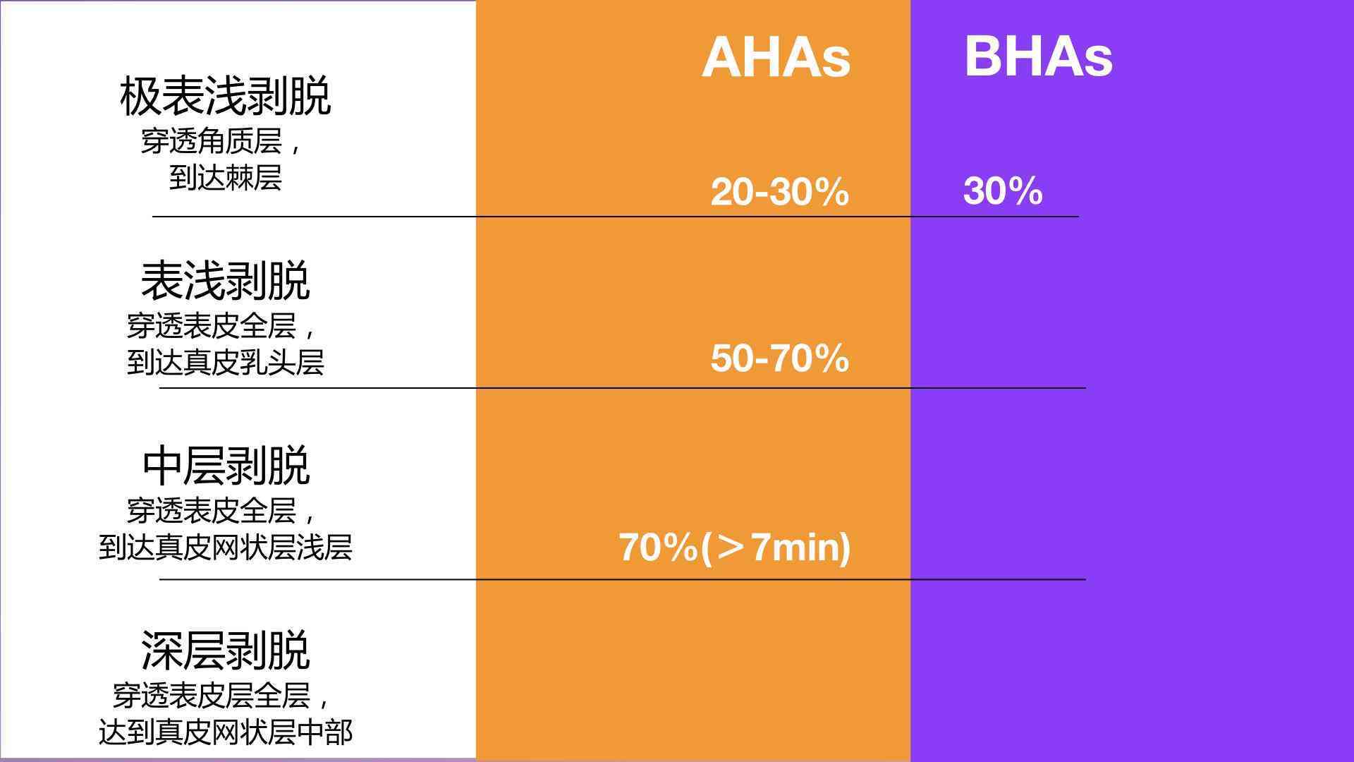 如果要更强大的抗衰老效果、刺激真皮层释放透明质酸,或要改善浅表瘢痕的话,就需要用高浓度的剥脱剂,包括使用超过10分钟的70%果酸。