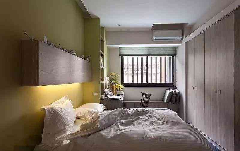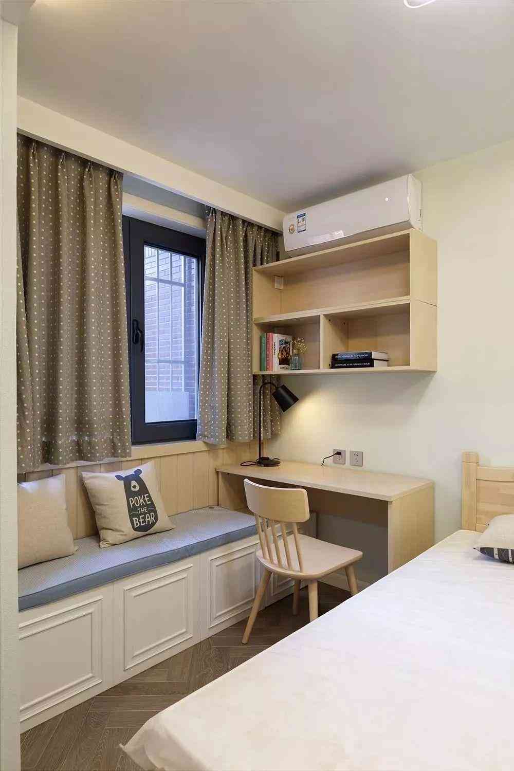 直接在飘窗上方架一个柜子,用来作为床头柜、书桌,这样的布局不会影响飘窗本身的收纳和布置,非常实用。