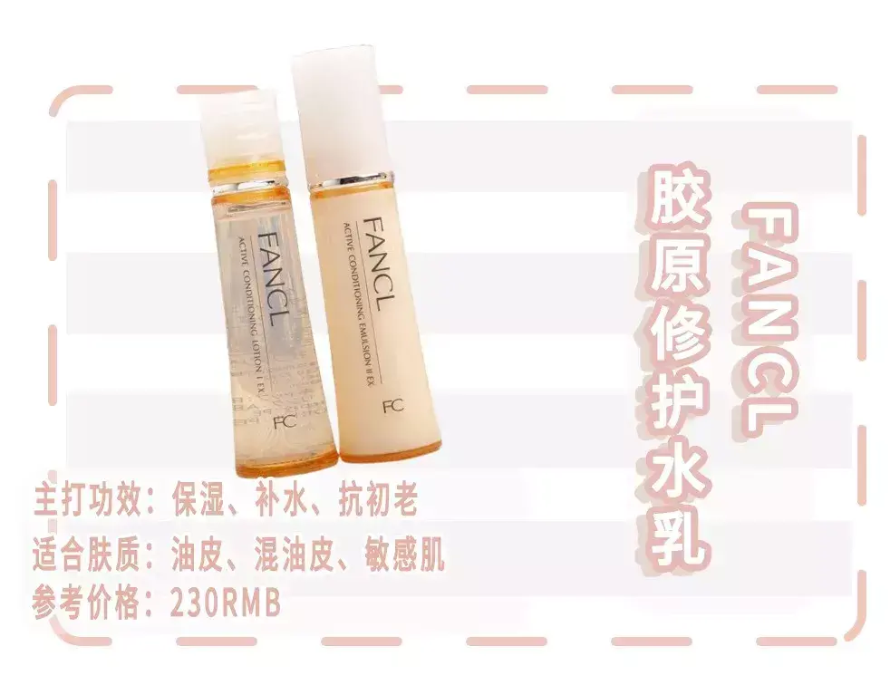 Fancl家也是一个让我觉得很放心的品牌,主打安全无添加,连孕妇都可以使用!而这款胶原修护水乳不同于一般的基础保湿锁水,它含有三肽胶原蛋白成分,还可以补充胶原蛋白哦!很适合有抗初老需求但预算又不是很多的朋友。
