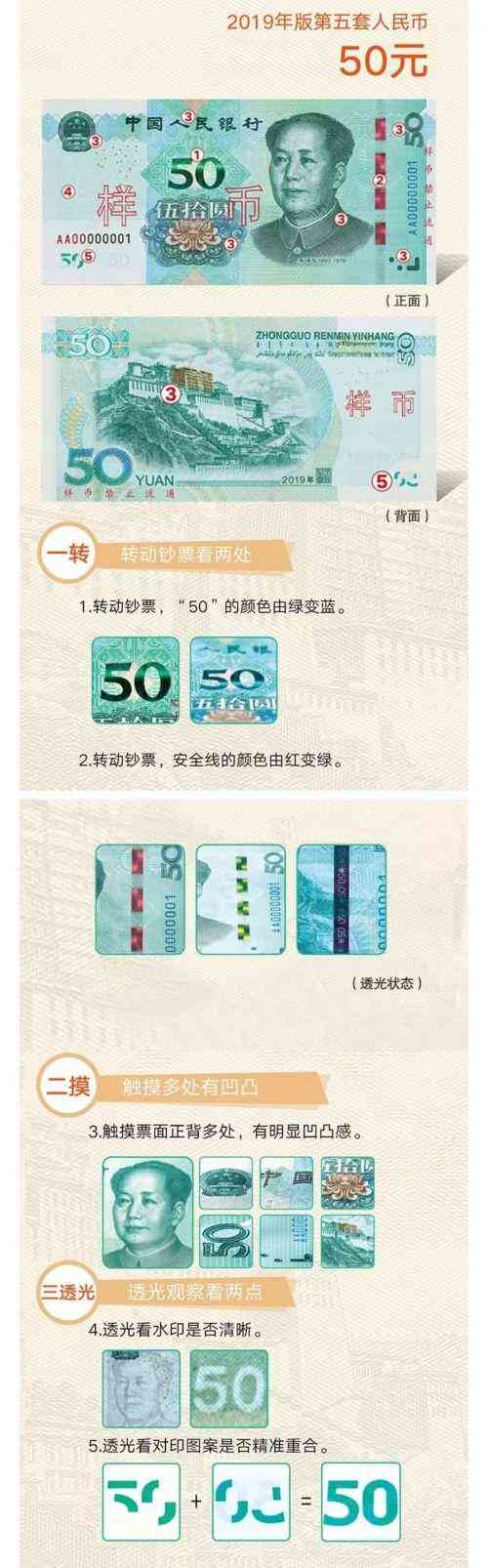 “三透光”这招适用于新版人民币50、20、10元。透光观察,背面和正面图案会组成一个完整的面额数字“50”“20”“10”,并且图案精准重合。此外,所有新版人民币纸币都可以通过透光看水印来辨别。50元的水印图案为毛泽东头像和数字“50”;20、10、1元的分别为荷花、月季、兰花及面额数字。