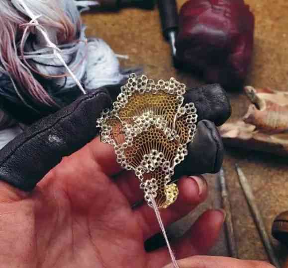 制作这样一件细腻精巧的珠宝,工艺师首先要在一枚完整的金片上凿出圆孔,然后通过金属细丝精细地镂刻出蜂巢状的结构,形成手镯、戒指侧壁上细密的网纹,最后对每一个镂空面进行抛光打磨,并嵌入钻石。