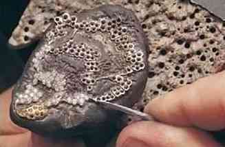 在已经钻好孔的金片上凿出蜂巢的五边形,每个小孔需要至少5次微雕才能完美成型。
