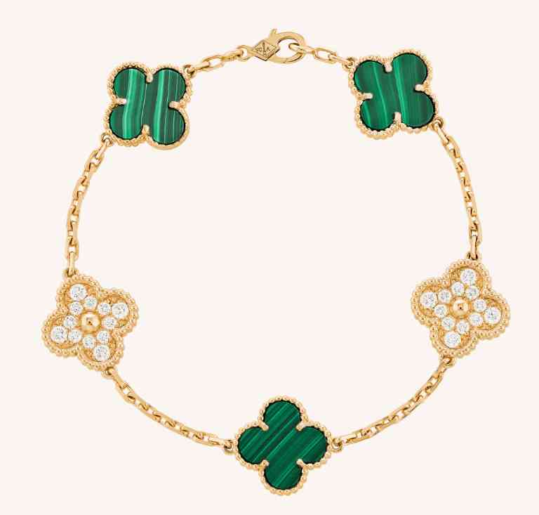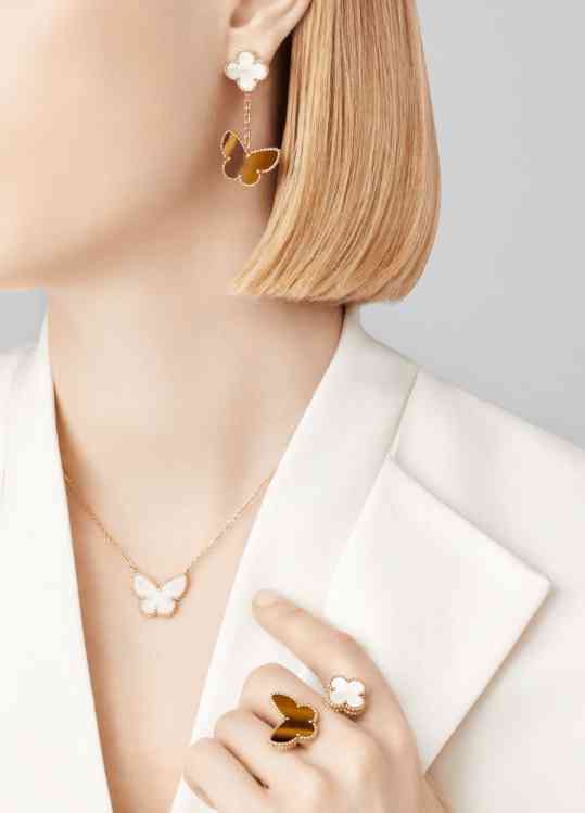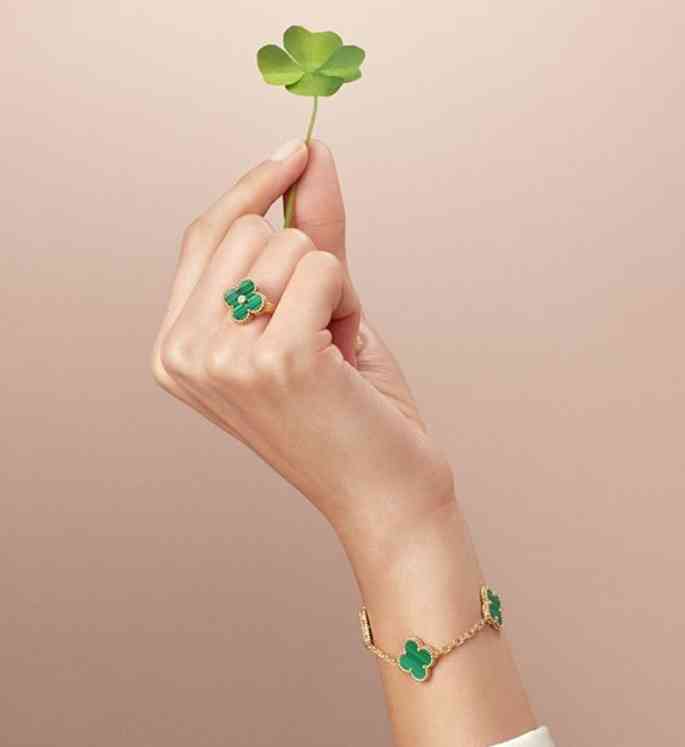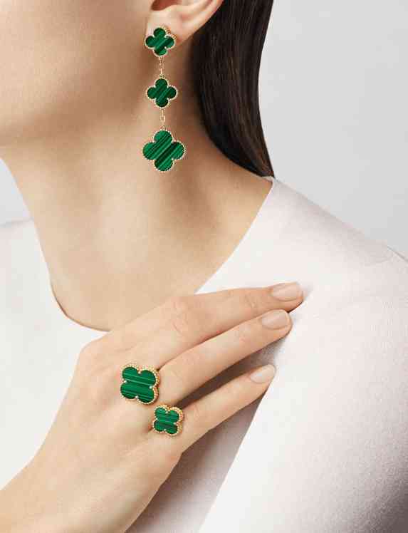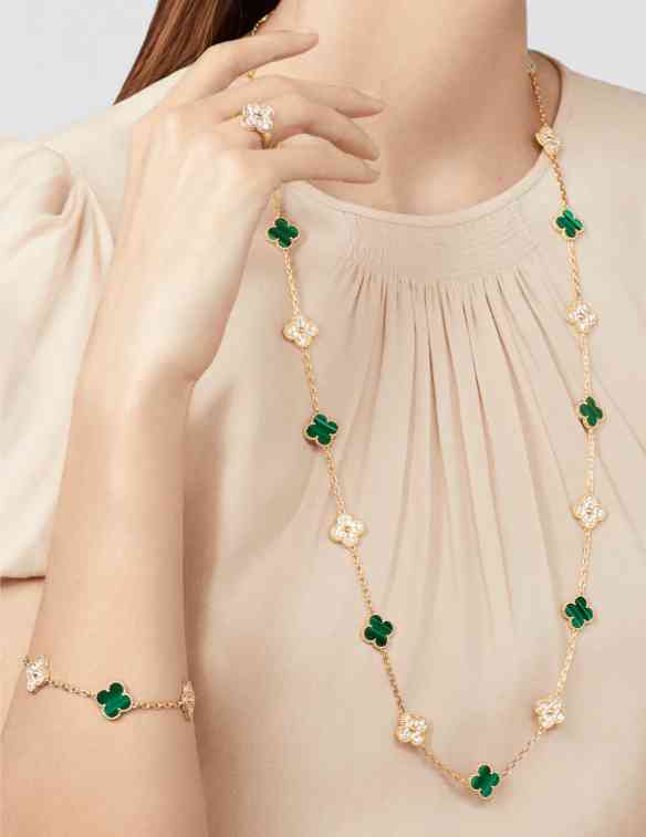 白色珍珠贝母流露清丽华彩,祖母绿孔雀石优雅点缀于指间与腕间,尽显灵动之美。