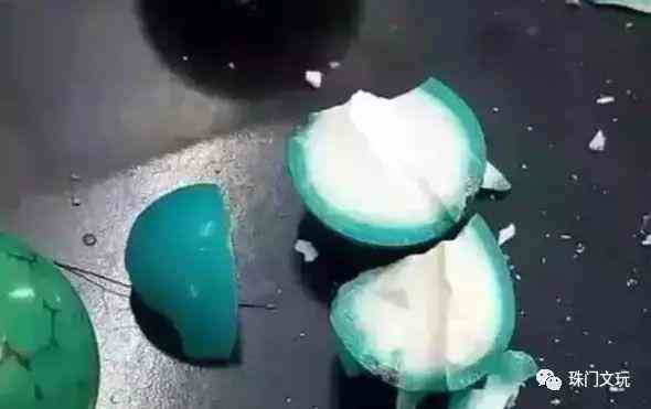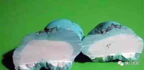 目前来说用菱镁矿做成的松石仿真度很高,如果不入手的话,仅看照片就是老师傅也“吃药”。上图是染色后的假松石。我们在来切开后看看里面是什么样子的?