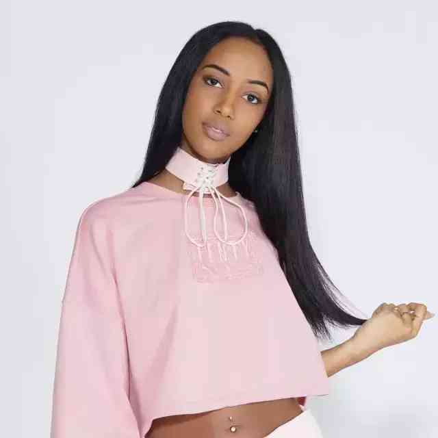 类似设计Fenty 还推出过更有女人味的系带款,脖子细长的模特勉强Hold 住。