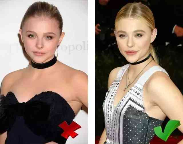 虽然长了一张小尖脸,但上半身肉肉多,溜肩、脖子短的“超杀女”。整个脖子都被宽Choker “吃掉了”,非要戴Choker 的话换成纤细款,就好很多。