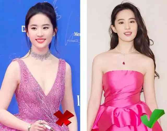 刘天仙的颜值毋庸置疑,其实脖子也算修长,溜肩可能是身材最大硬伤。同样是带卡脖子长度的珠宝,夸张的宽版虽然看起来更华丽,但是会放大溜肩的缺陷。