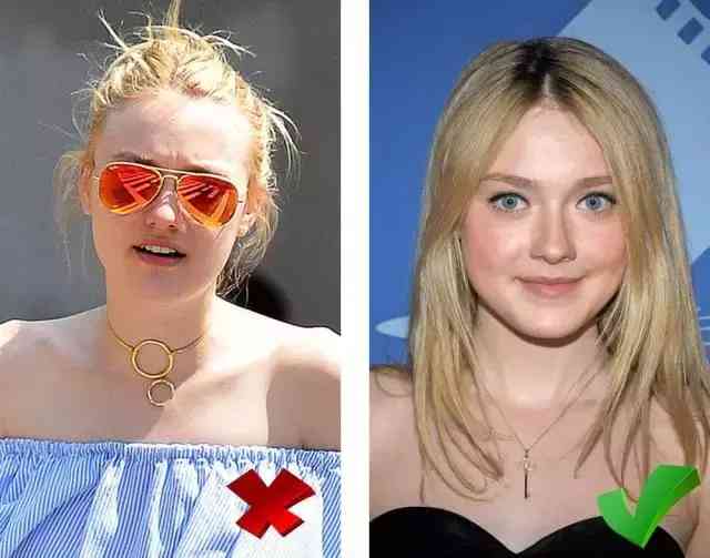 即使同样是纤细精致款式,Dakota Fanning 戴着圆圈组合项链,也显得脸更大了,换成有竖长款式对脸型修饰更明显。