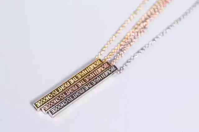 这款项链整体设计上是细链条+长方形吊坠,精致秀气而且不挑脸型,吊坠上刻着一句鼓舞每一位女生的话:Women have the right to choose。