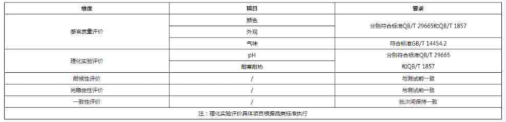 检验方法:颜色、外观、pH值、耐寒耐热按照QB/T 29665和QB/T 1857进行操作检验。气味参考GB/T 14454.2进行操作检验。耐候性:对产品进行加速老化等稳定性测试。光稳定性:模拟日光照射条件,对产品进行时间维度上的稳定性测试。一致性:对批次间产品进行稳定性比对