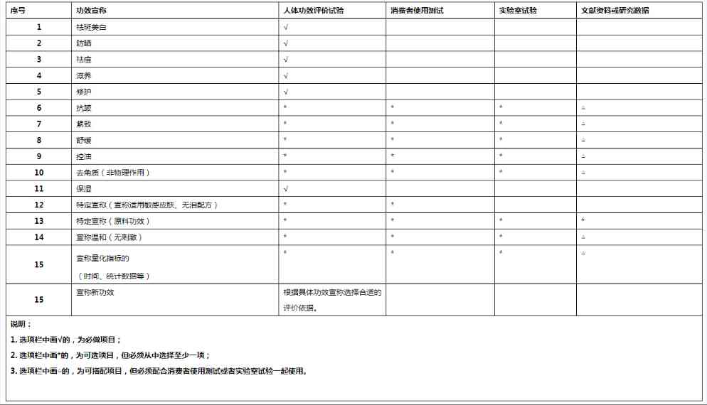 检验方法:美白功效遵循《化妆品安全技术规范》检测。保湿遵循行业标准方法QB/T 4256检测。对于我国没有强制性标准或技术规范的功效宣称,应按照《化妆品功效宣称评规范》的规定选择合适的方法进行检验。