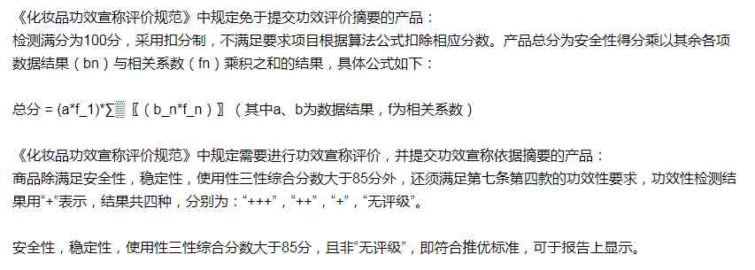 京东对于“《化妆品功效宣称评价规范》中规定免于提交功效评价摘要的产品”及“需要进行功效宣称评价并提交功效宣称依据摘要的产品”设定了不同的评分标准。