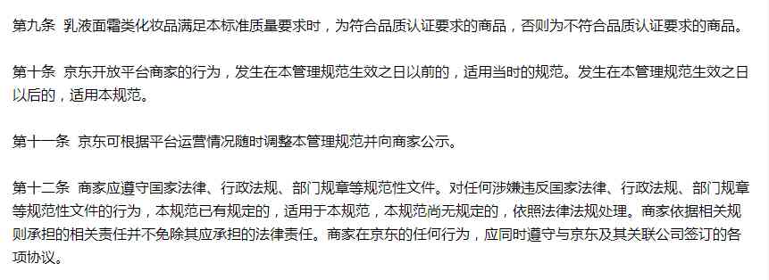 4月29日,京东发布关于“开放平台乳液面霜类化妆品品质认证质量标准”公告(下称“《规范》”),该《规范》于2022年5月6日(今天)正式生效。