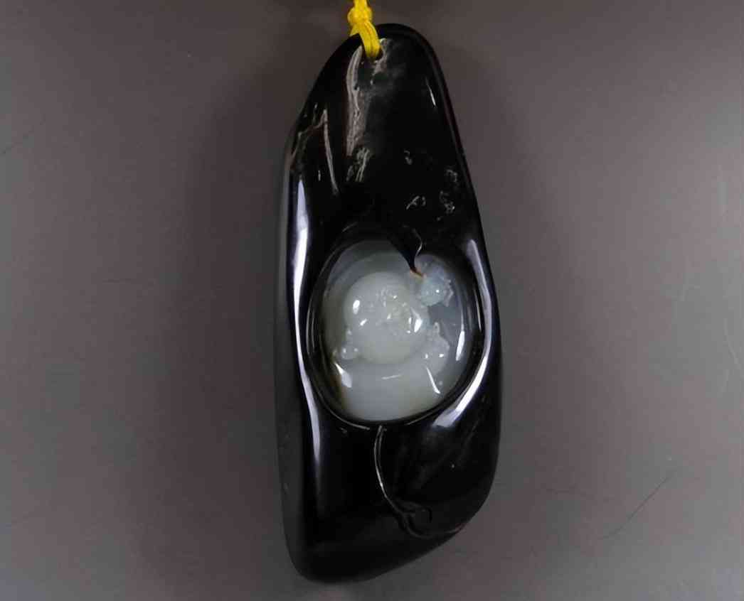墨玉是地壳中的石墨渗入进白玉里形成的,打灯可以看到墨玉里面含有黑色的墨点。尽管漆黑者为上品,但玉的边缘也要透光,因为和田玉的特性所以墨玉也极油润。很多时候,因为是全黑因看不出白玉底,以至于被人误解成黑石头,所以墨玉中的白玉底还是要有的,恰到好处为最好。