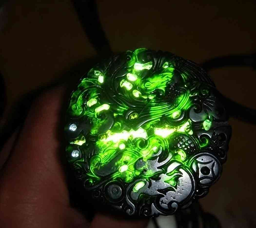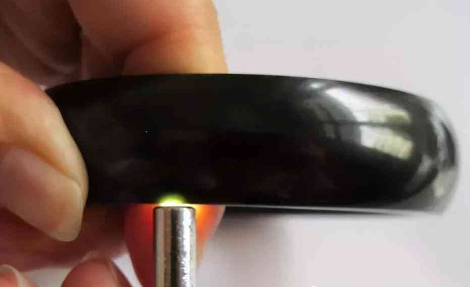 墨碧玉一般正常光下它会呈漆黑色,如用强光或者是专用的手电筒照射可以看到碧玉的边缘透着绿光,墨碧玉本质上是碧玉。