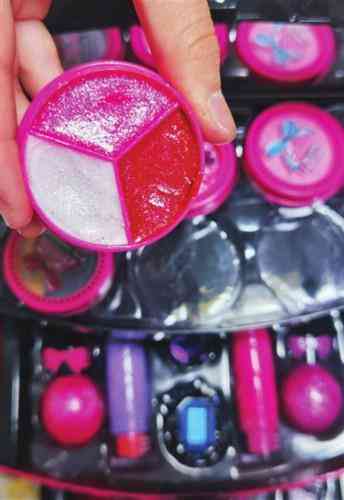 “女儿特别兴奋,迫不及待要照着镜子往脸上抹,我一看这产品太不安全,生生给拦下来。好说歹说,女儿还哭了一场,才勉为其难同意不用在自己脸上,而是用来给娃娃化妆。”杨女士说,在此之后她还曾经在夜市给女儿买过一套儿童美妆产品,情况和上次差不多,这次虽然产品外包装盒标注了成分,但基本都是化学物质,没有具体含量,也没有检测报告。同样,产品类别也是玩具。