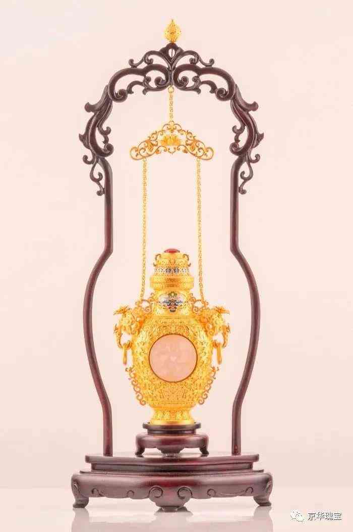 作品采用宫廷皇家宝瓶形制,尽显尊贵华美、典雅脱俗的体态;瓶口镶嵌一颗珍贵红玛瑙,象征鸿运当头、当红鼎盛的祥瑞之兆;瓶口之下纹饰复杂纷呈,线条繁缛细腻,万千工笔之中以珐琅工艺点染和谐江山的盛世彩纹,象征着和平发展之下伟大祖国日新月异的发展变化,寄托着和平盛世、四海升平的美好祝愿。