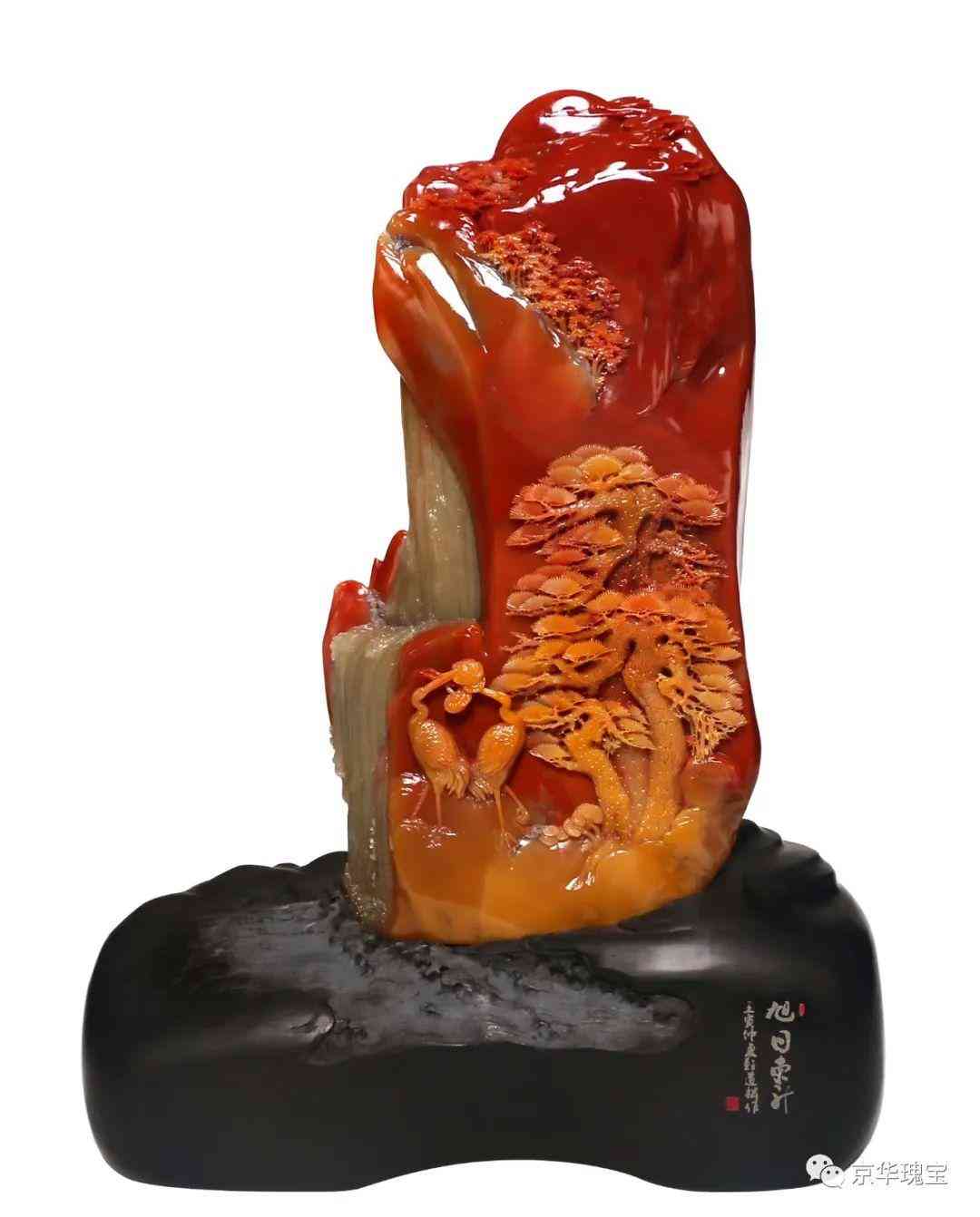 作品选用保利三彩石,色彩艳丽、分明,色泽温润似玉,以简练的刀法生动描绘了双鹤闲逸自在,苍松劲秀,白色雕刻成奔流不息的飞流瀑布,山顶一轮通红的旭日正从漫天云雾中冉冉升起,动态十足,朝阳圆满宏达、明艳似火的壮丽场景,四者形态、色彩各异,对比鲜明相得益彰,共同构成一幅以小见大、气势辉宏紧扣主题,宛如水墨的和谐画面,象征着春秋不老,松鹤长春,事业蒸蒸日上,人生欣欣向荣。