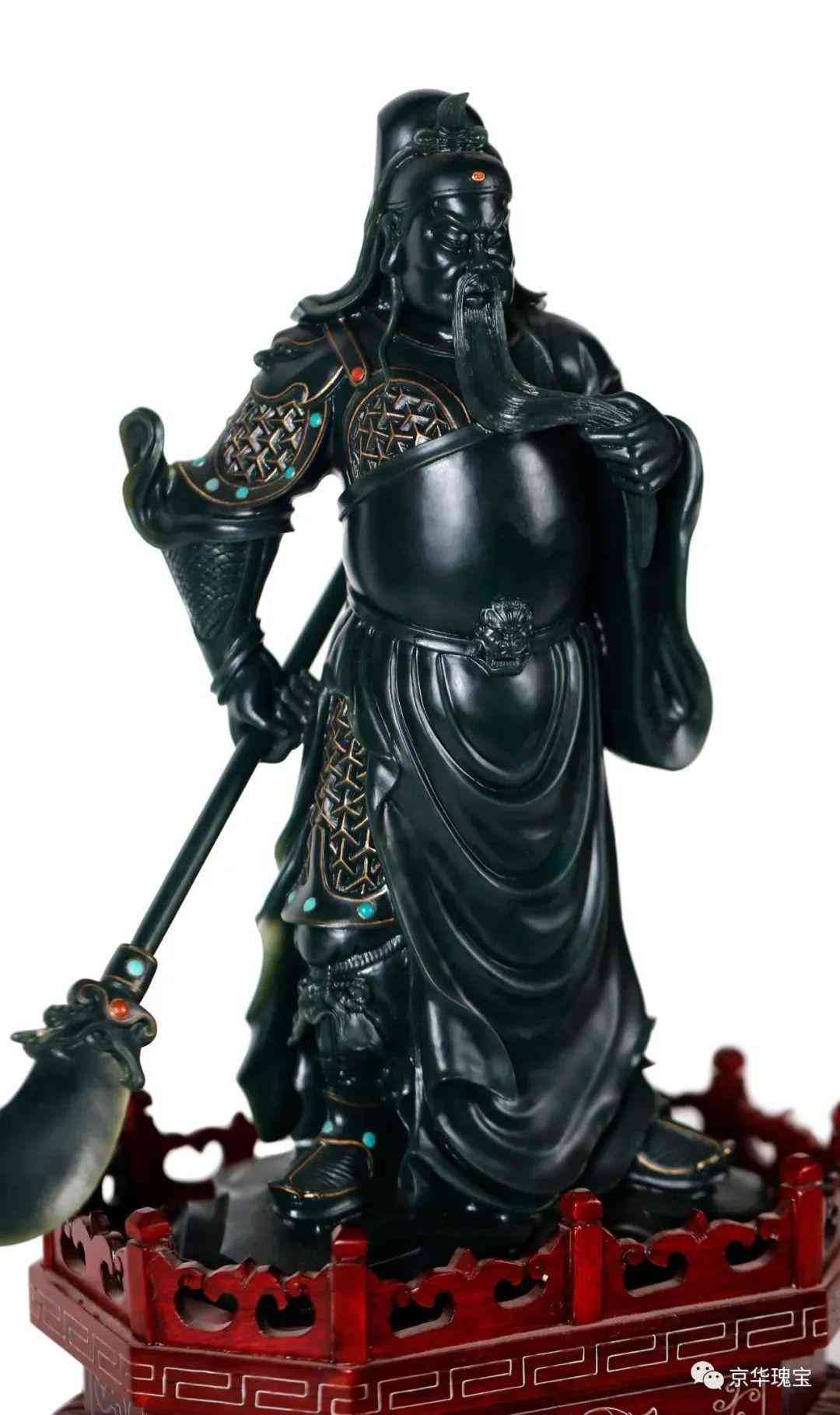 作品选用和田青玉制作而成,质地缜密,油润光泽,采用圆雕错金嵌宝石制作工艺,人物刻画生动,丹凤眼,卧蚕眉,身披黄金甲,手持青龙偃月刀,忠肝义胆,威风凛凛。