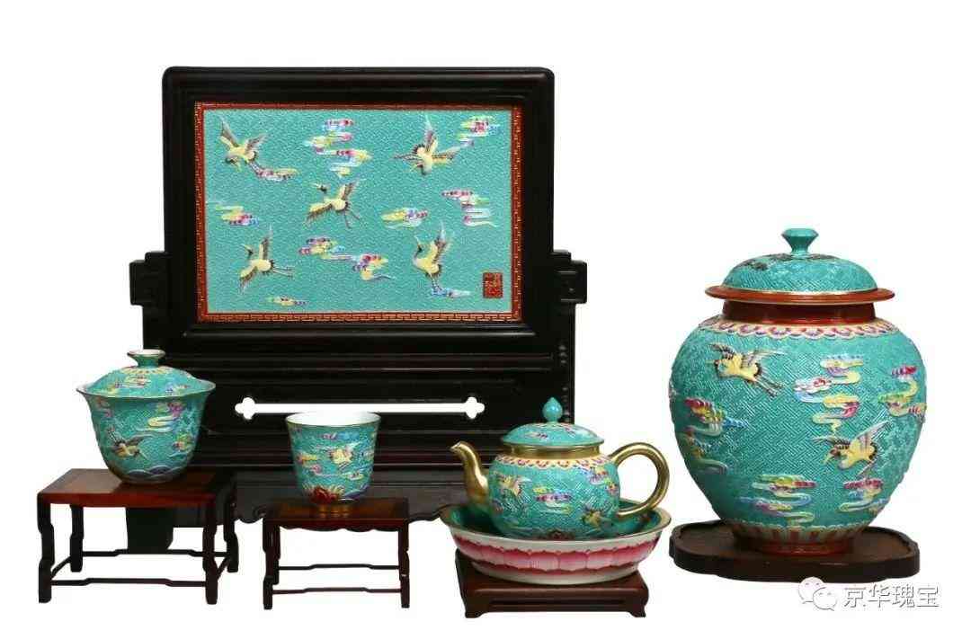 整套作品采用雕刻工艺,疏密有致、重叠交错的万字纹遍布整个瓷器,气质古朴大气;以湖水绿为主色调,色泽如湖水般清澈,釉面光润晶莹。五彩祥云随风浮动,瑞鹤在祥云当中自由飞舞,呈现出一幅自由浪漫的场景。色釉的华丽与雕刻的精细搭配,将仙鹤展翅的立体感,流云纹饰的灵动感展现出来,雕刻技法的灵活运用,仙鹤的精美雕刻的惟妙惟肖,仿若仙鹤随秋风而起,其声清越,自在安逸,文气又不失灵动,近可品味仙鹤身姿,远可欣赏整体风采。