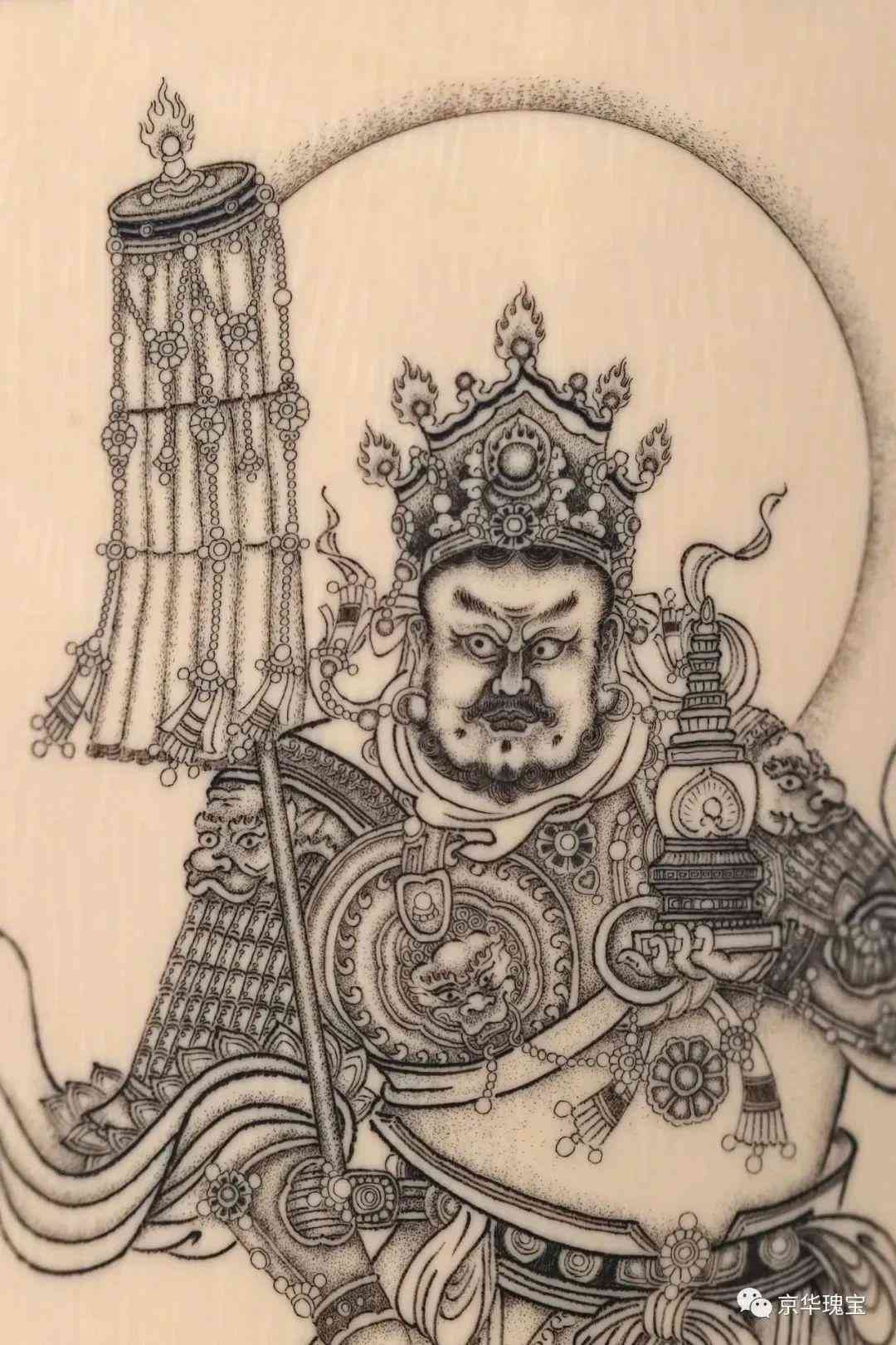 作品内容以明代法海寺(北京)中的壁画四天王为主,在民间四天王也被称为风、调、雨、顺四方正神。作品以传统平刻工艺,以刀代笔来刻画。人物刻画细腻,线条流畅,人物表情生动,铠甲璎珞刻画严谨,一丝不苟,整体统一,寓意吉祥如意。