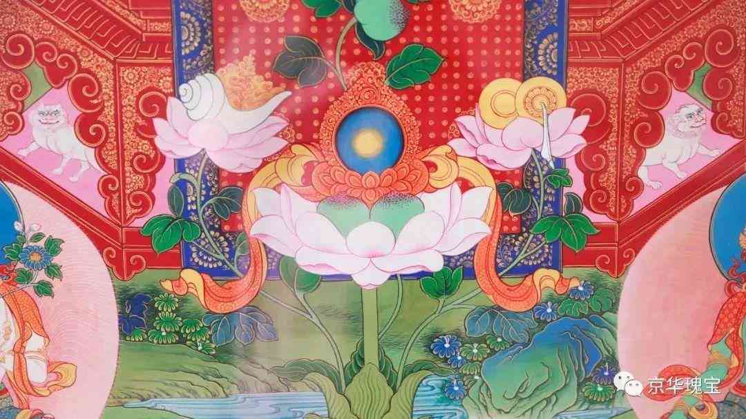 北京宫廷风格唐卡是传承于清朝时期在北京、承德等藏传佛教的皇家寺院,如北京雍和宫。此幅唐卡正是以传承北京宫廷风格唐卡传统工艺而绘制,主尊为阿弥陀佛跏趺坐于莲台之上,上方天界为长寿佛左右两侧绘制了天女在云间向下洒甘露,主尊下方为白度母和绿度母,画面的背景正是汉风浓郁的山水构图,色彩运用上也是故宫唐卡图典有据可依的典型样式。