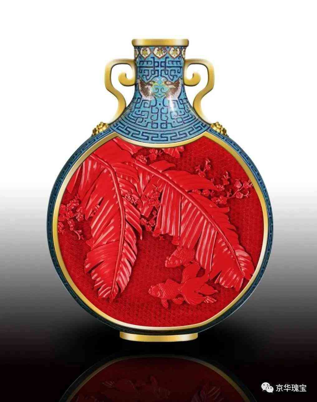 作品用雕漆与景泰蓝工艺进行结合设计,两种工艺在形式、材质进行结合突破,色彩上采用了白色与红色搭配。作品构图现代,纹饰古雅大方,层次丰富,掐丝粗细均匀而流畅,雕刻细致而入微,层次清晰鲜明,作品给人一种清新感。