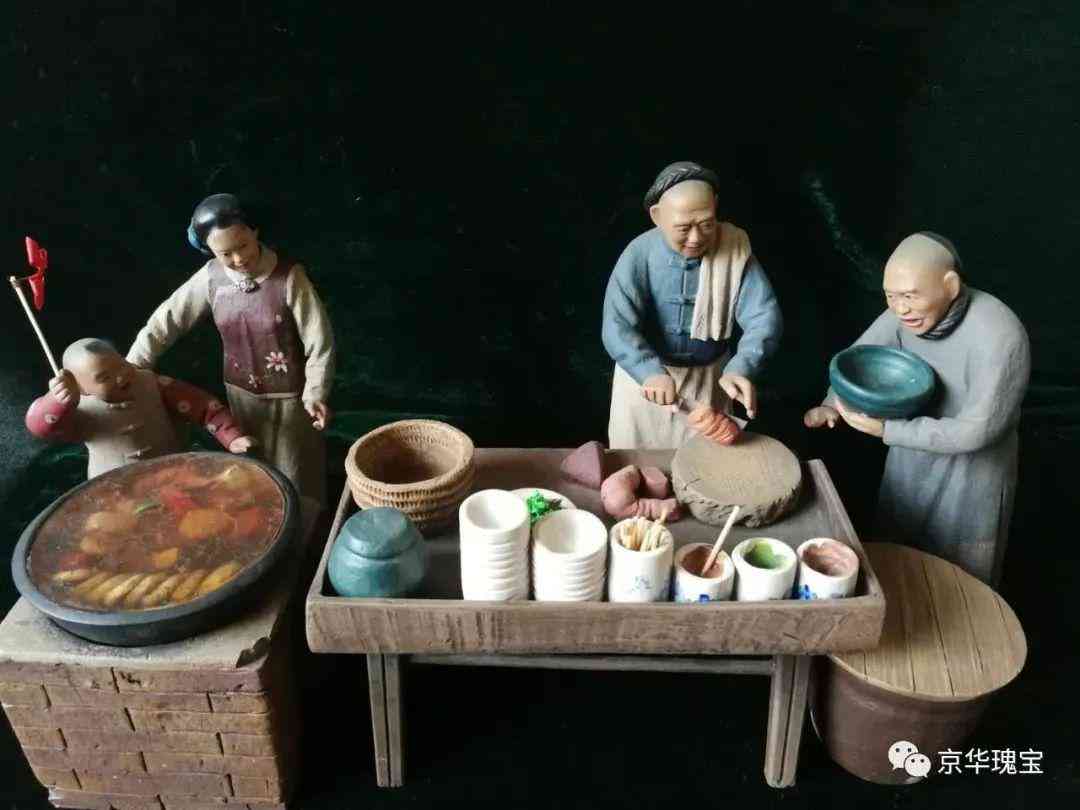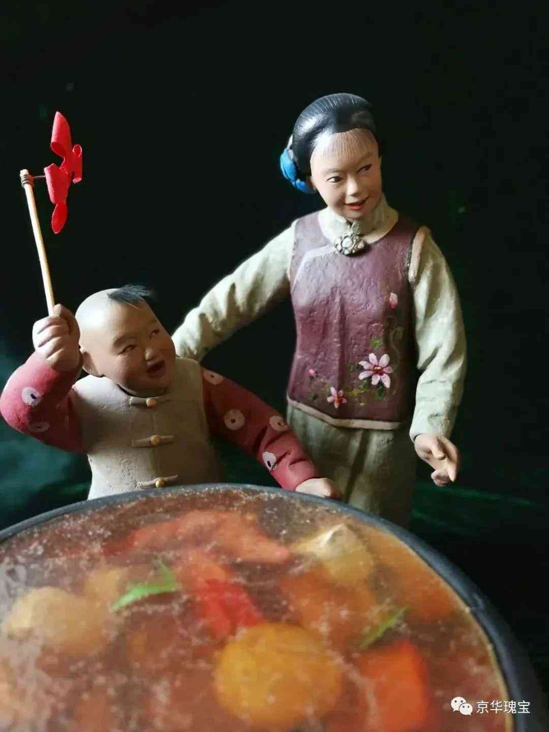 作品表现了旧时老北京卤煮火烧摊位前的场景,摊主娴熟的手艺,客人垂涎欲滴的模样,妇人携孩童雀跃地赶来。人物形象生动,道具细致,展现了泥人张自然,朴实,灵巧的传统雕塑技法。