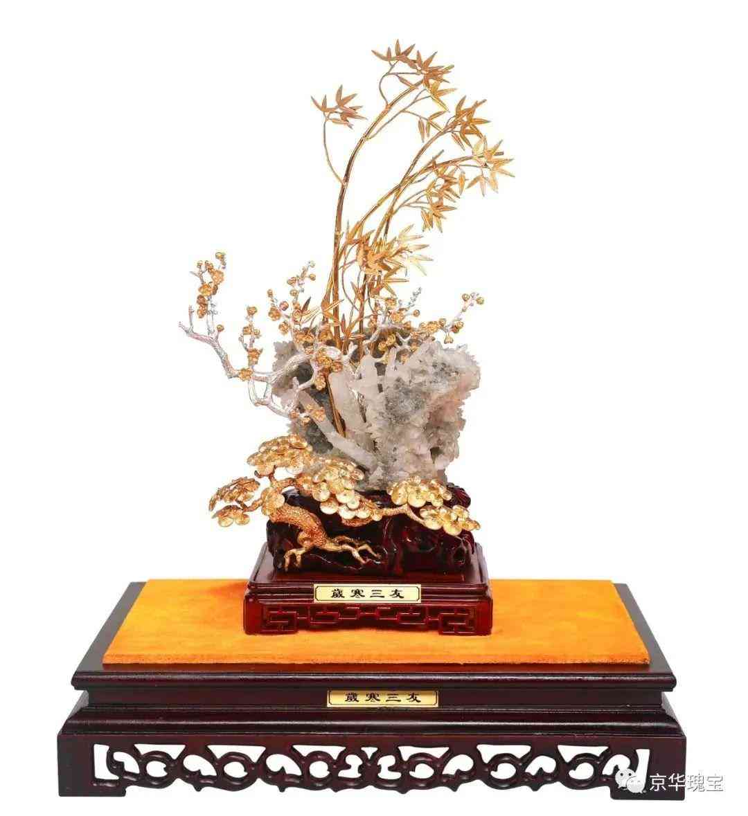 作品采用传统花丝镶嵌和浇筑工艺精致而成。设计者利用天然萤石火山岩液冷却形成晶体,颇似冰清玉洁的寒冬山景。又采用传统宫廷技艺的花丝镶嵌工艺,设计制作了传统文化中的“岁寒三友”——松、竹、梅题材,形态傲骨迎风,挺拔而立,有清廉自洁,守护初心之意。