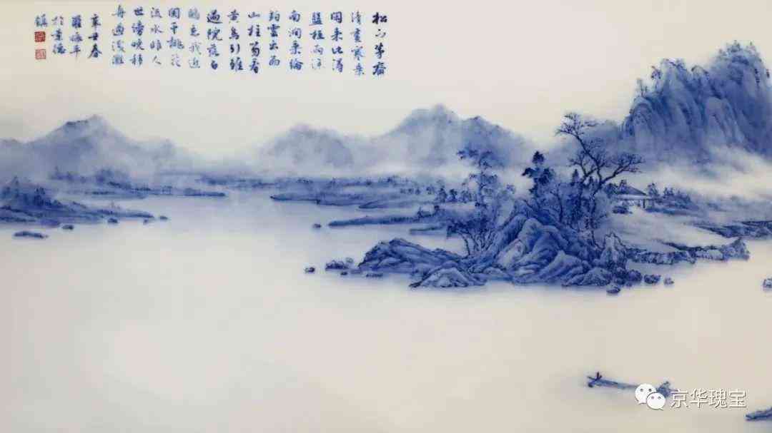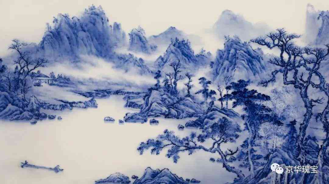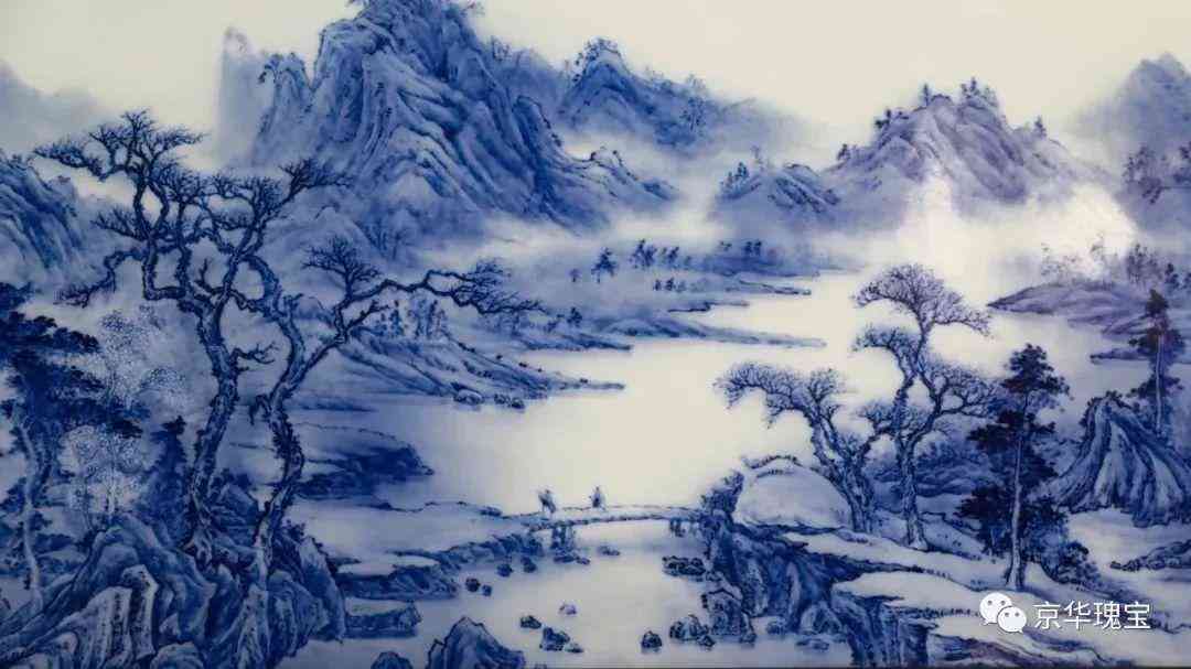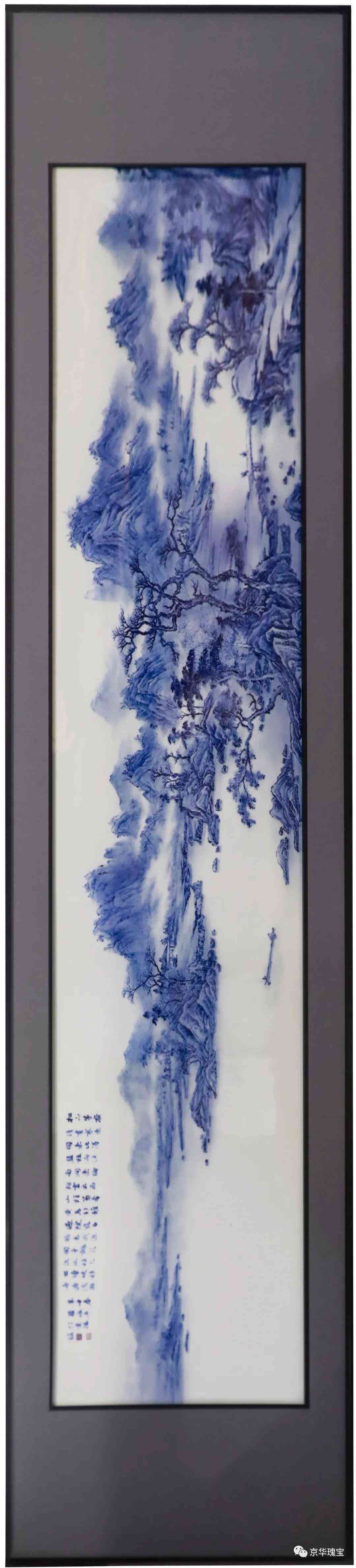 作品为釉下青花瓷板画,是在瓷胎上绘制再罩透明釉经高温烧成的白底蓝花故名。画面明净素雅并具有宋代工笔山水的特点,用笔细腻精微,渲染虚实相生,云雾浮动意境清远高旷。山间溪流无痕、小桥只帆、林麓屋舍、烟岚缭绕其间。点缀文人高士或持杖访友或携琴童跨桥或是为沽些美酒而来,表现其悠闲的生活情趣。作品着重宋画传统的技法表现即:勾、皴、擦、点、染。以现代技法为辅把自然景色的深刻感受融为一体、和谐统一、给人以美的享受。