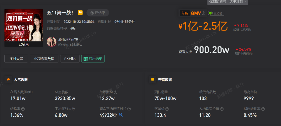 虽然一直被质疑谈判节目的形式模仿李佳琦,但并未影响引流效果。10月23日,潘雨润开启双11场直播,新抖数据显示,有900万人次观看了此次直播,累计销售额在1亿-2.5亿元之间。