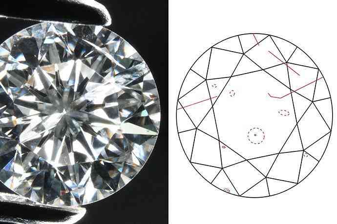 净度分布图是用不同符号去定位和描述钻石包裹体的位置和类型,并不是说,净度分布图上有一个椭圆形虚线,而钻石身上就会有椭圆形这么大面积的一个包裹体。