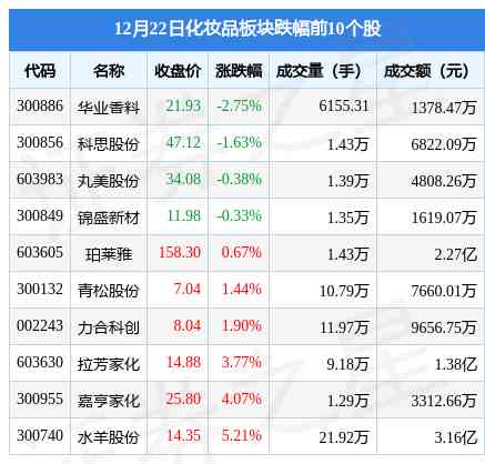 12月22日化妆品板块较上一交易日上涨4.26%,上海家化领涨。当日上证指数报收于3054.43,下跌0.46%。深证成指报收于10876.31,下跌0.33%。化妆品板块个股涨跌见下表: