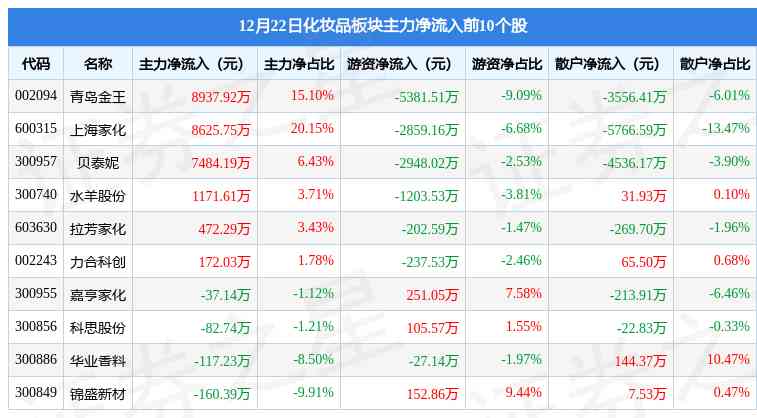 从资金流向上来看,当日化妆品板块主力资金净流入2.48亿元,游资资金净流出1.16亿元,散户资金净流出1.32亿元。化妆品板块个股资金流向见下表:
