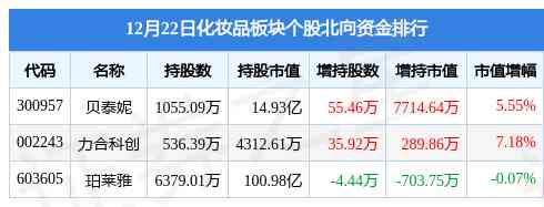 北向资金方面,当日化妆品板块北向资金持股市值为116.35亿元,增持0.73亿元。其中增持最多的是贝泰妮,增持了0.77亿元。减持持最多的是珀莱雅,减持了703.75万元。化妆品板块北向资金持股变动明细见下表: