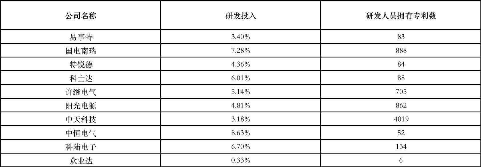 表1 “新能源充电桩”赛道企业研发强度及发明专利数