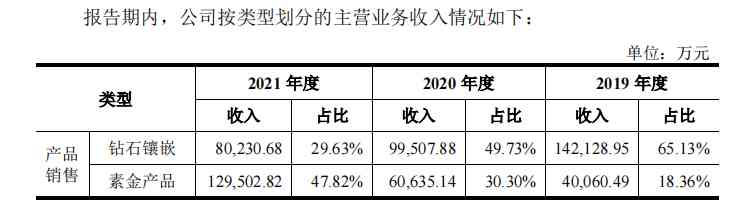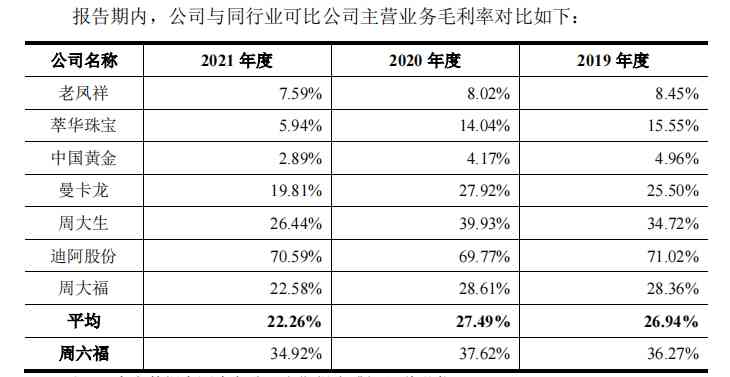 根据招股书中的介绍,公司毛利率高于同行,主要系销售模式及产品结构存在一定差异所致。而2019 年及2020年,公司经营模式、产品结构与周大生相似,但同期毛利率比周大福高7.91个百分点、9.01个百分点。即使2021年公司调整了经营模式,毛利率较低的素金类产品占比提升,但公司的毛利率仍比同行平均水平高出12.66个百分点,比周大福高出12.34个百分点。