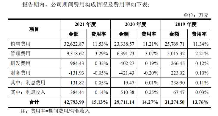在珠宝行业中,周六福的名气不如周大幅、周生生等老字号,或许这和它的研发有关。在研发费用上,2019年至2021年,周六福的研发费用为266.45万元、402.27万元、984.43 万元,占营收比例分别为0.12%、0.19%、0.35%,远不及同期的销售费用投入。