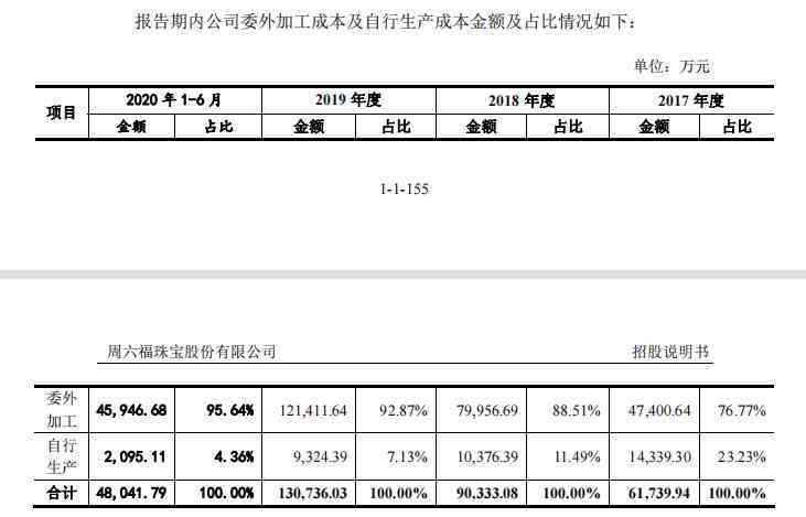 从产品的生产模式来看,周六福也多是采用的委外加工,只有少量自行生产。从2020年披露的招股书中看到,在生产加工成本上,2017年至2020年1—6月,委外加工成本占比为76.77%、88.51%、92.87%、95.64%。可见,周六福在委外加工的投入远远大于自行生产。