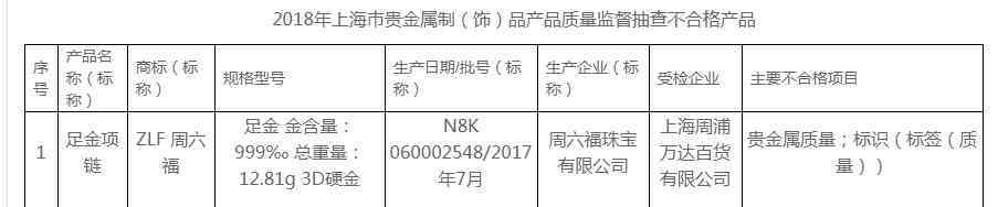 例如,2018年,上海市市场监督管理局发布抽检情况,共抽查产品76批次,经检验,不合格2批次,周六福为其中之一。其中上海万达百货的周六福店内足金项链不合格,不合格项目:贵金属质量;标识(标签(质量))。