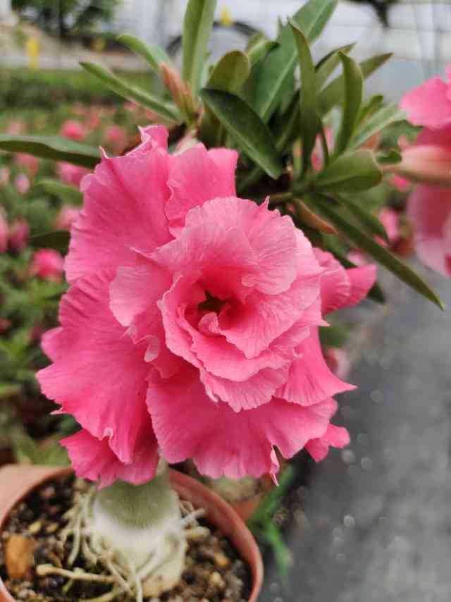 3、沙漠玫瑰耐旱,平常最好等到盆土干透了再浇水,千万别让花盆积水,不然十有八九要烂根!