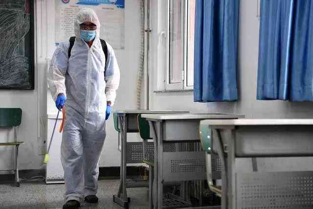 天津中学,防疫人员对考场进行消毒(图源:新华社)