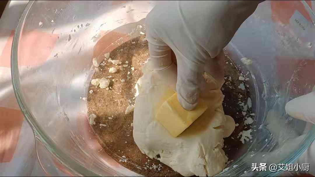 6、加 入玉米油、黄油、过筛高筋面粉揉匀,揉成光滑的面团;