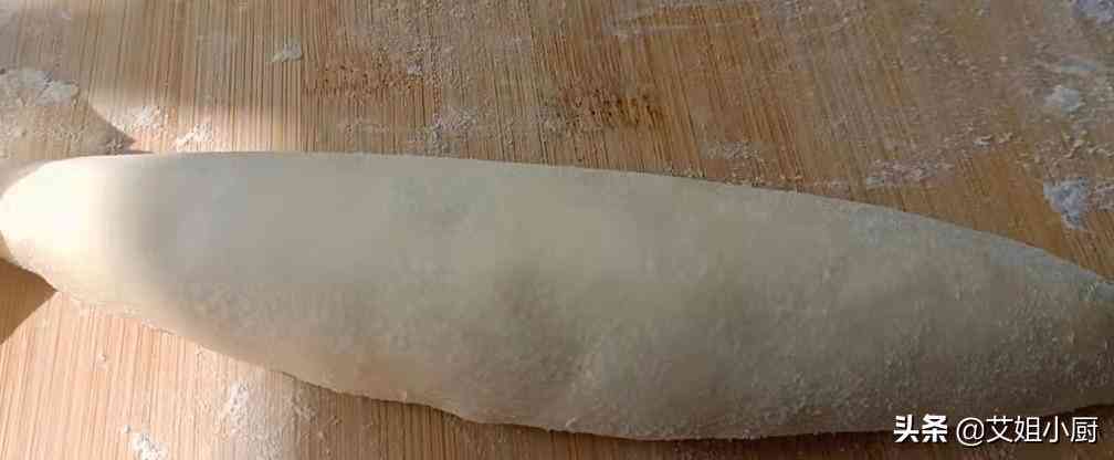 11、面板上撒上面粉,取一个剂子揉圆用擀面杖压扁;