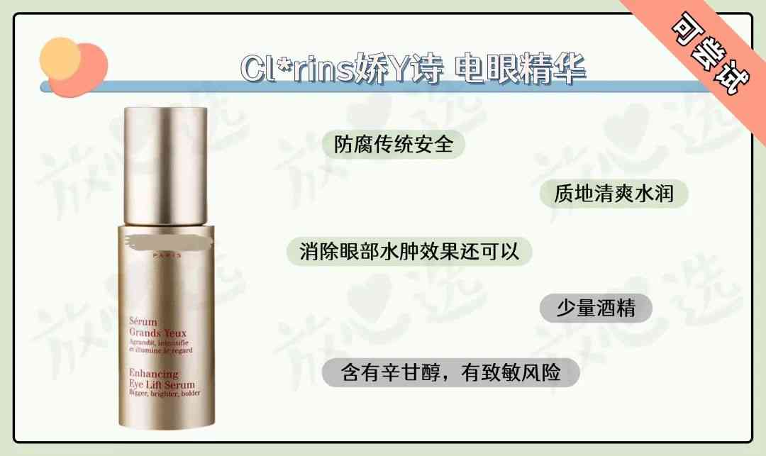 综合来看,这款眼精华比较适合有消肿需求的油皮姐妹,干皮姐妹需要后续叠加霜类产品。但是含有辛甘醇,有一定的致敏风险,需要进行测试后再使用。