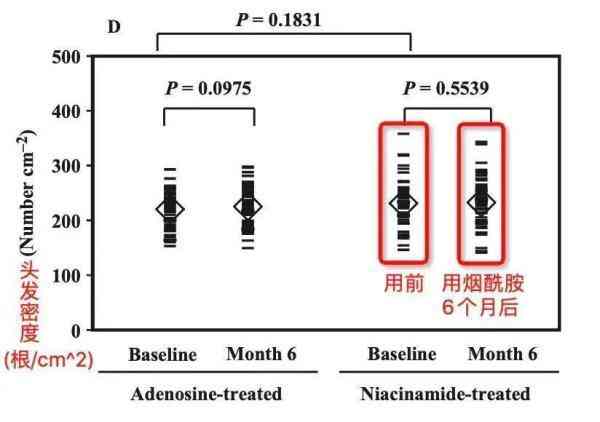 其实这也不是篇验证烟酰胺对毛发影响的文章,2015 年有过一篇论文,本来是想研究外用腺苷治疗脱发的效果,使用了烟酰胺乳液作为对照组,最后却发现,作为对照组的烟酰胺对毛发密度并无影响[ 4 ] 。